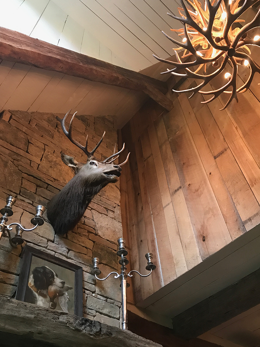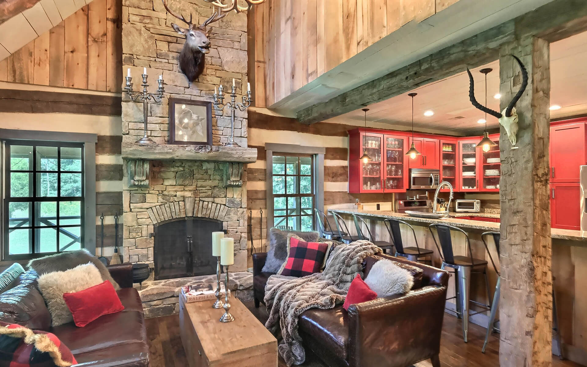 This open concept living space was constructed from 150 year old logs and boasts 20’ ceilings. The heated floors are hand scraped hickory. The double story dry stacked stone fireplace dominates the space and inspires good conversations on cold winter nights. Two massive leather couches and a leather chair and ottoman provide cozy seating and the nineteenth century pine box doubles as a coffee table and blanket box. Need more seating? Pull up the two ottomans tucked beneath the window. If you want to enjoy the cool mountain breeze, just open the french door. Antiques and hand picked artwork adorn the space.