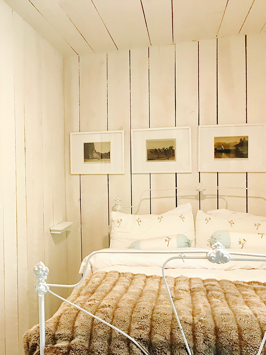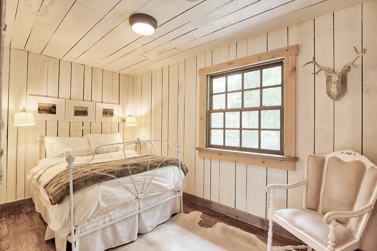 This cozy room features a full size bed, spacious closet, french mirror and vintage linen chair. It is decorated with nineteenth century photos of Native Americans on the plains. The paneled walls are white as are the high quality cotton linens. This room looks out over the decks and beyond to the river.